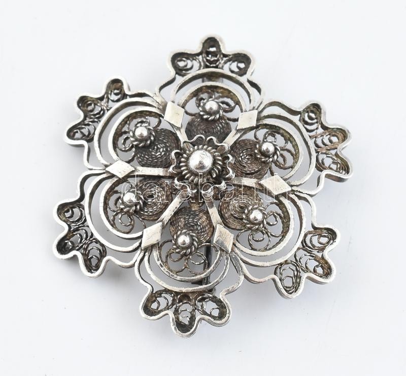 Ezüst (Ag) filigrán kitűző, jelzés nélkül, 7,79 g, d: 3,5cm https://www.darabanth.com/de/399-Fernauktion/399.0/Juwelen/Juwelen~1500020/Ezust-Ag-filigran-kituzo-jelzes-nelkul-7-79-g-d-3-5cm~II2443785