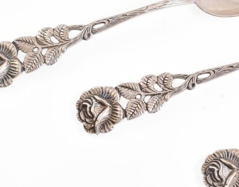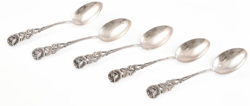 Beschreibung: Ezüst(Ag) rózsás nyelű teáskanál, jelzett, 5 db, h: 12 cm, nettó: 75,3 g