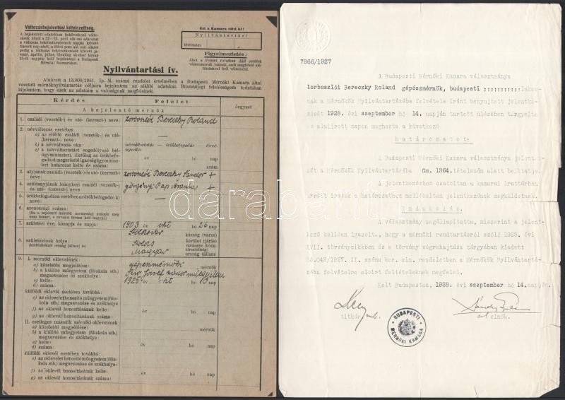 1925 Torboszlói Bereczky Sándor Roland gépészmérnök kamarai felvételér... https://www.darabanth.com/de/399-Fernauktion/399.0/Kunst-Dokumente-andere-Sammelgebiete/Dokument~500020/1925-Torboszloi-Bereczky-Sandor-Roland-gepeszmernok-kamarai-felvetelerol-szolo-okmanyok~II2435370