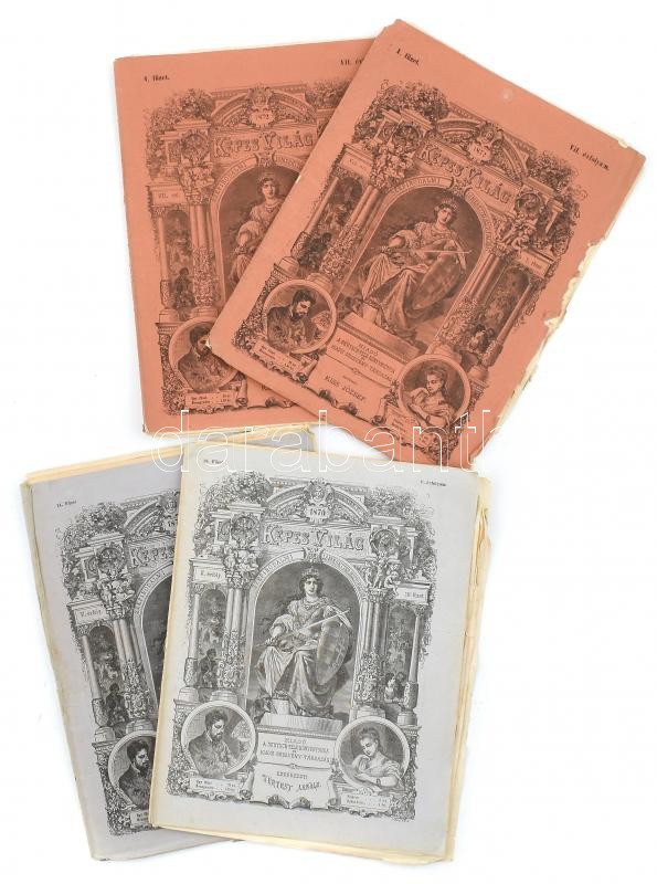 1870-1872 Képes Világ 4 száma: V. évf. 14. és 18. füzet, szerk.: Vértesy Arnold + VII. évf. 1. és 4. füzet, szerk.: Kiss József. Kiadja a Deutsch-féle Könynyomda és Kiadói Részvénytársaság. 32 + 32 +32 + 32 p. Helyenként szakadásokkal, foltos, hiányos lapokkal.