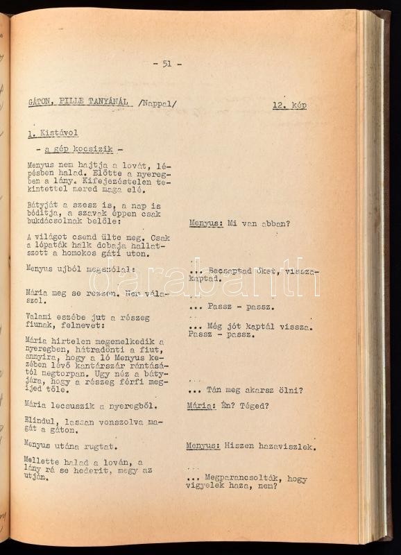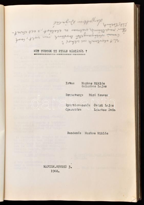 1968 Markos MIklós-Galambos Lajos: Pokolév. Mit tudtok ti Pille Máriáról?, fogatókönyv, rendező: Markos Miklós. Bp., 1968, MAFILM Studió 3., 169 p. Egészászon-kötésben, a hátsó 'fehér', szabad lapokon ceruzával Vászoli-Balogh László: Bigu c. regényének töredékes kézirata.