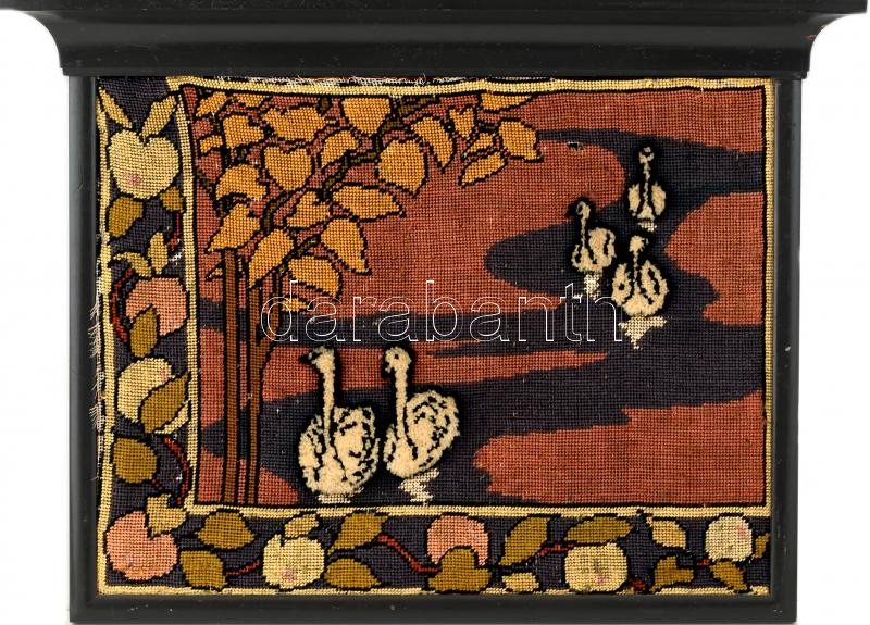 Beschreibung: Szecessziós stílusú gobelin, Otto Eckmann után szabadon, sérült, fa keretben, 39x50,5 cm