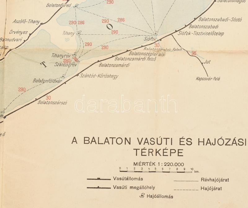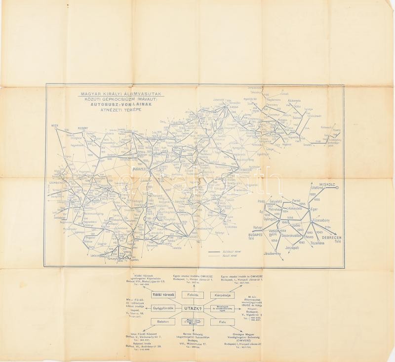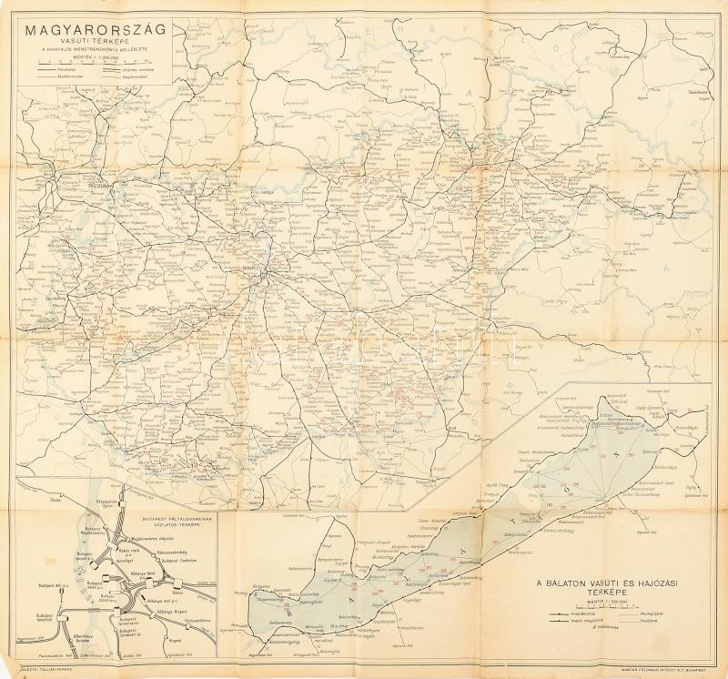 cca 1940 Magyarország vasúti térképe, a hivatalos menetrendkönyv melléklete, Balatoni vasúti és hajózási térképpel, 1:1,200.000, valamint Budapest pályaudvarainak vázlatos térképével, tervezte Tallián Ferenc, a hátoldalán a MÁVAUT autobusz-vonalak átnézeti térképével, 1:1,200.000, kiadja: Bp., Magyar Földrajzi Intézet Rt.,szakadozott, hajtott, 51x56 cm