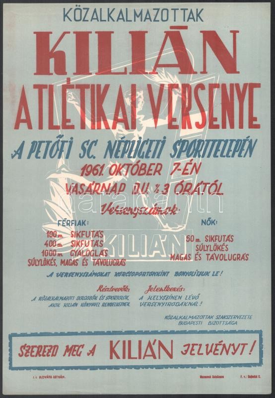 1961 Közalkalmazottak Kilián atlétikai versenye plakát, 40×28 cm https://www.darabanth.com/de/399-Fernauktion/399.0/Kunst-Dokumente-andere-Sammelgebiete/Plakat~500037/1961-Kozalkalmazottak-Kilian-atletikai-versenye-plakat-40C39728-cm~II2434117