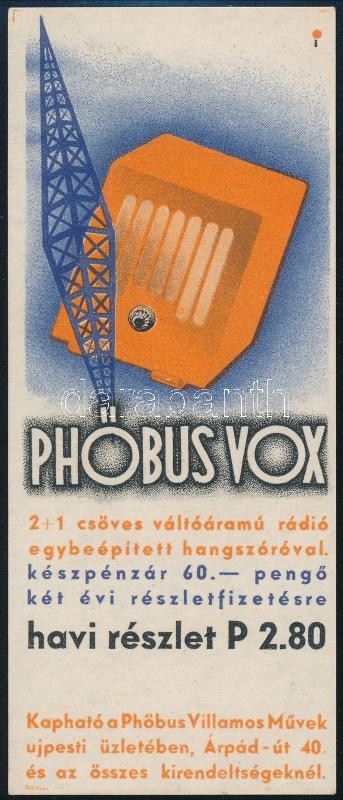 Phöbus Vox rádióreklám (Phöbus Villamos Művek) számolócédula https://www.darabanth.com/de/399-Fernauktion/399.0/Kunst-Dokumente-andere-Sammelgebiete/Werbungen~500024/Phobus-Vox-radioreklam-Phobus-Villamos-Muvek-szamolocedula~II2442931
