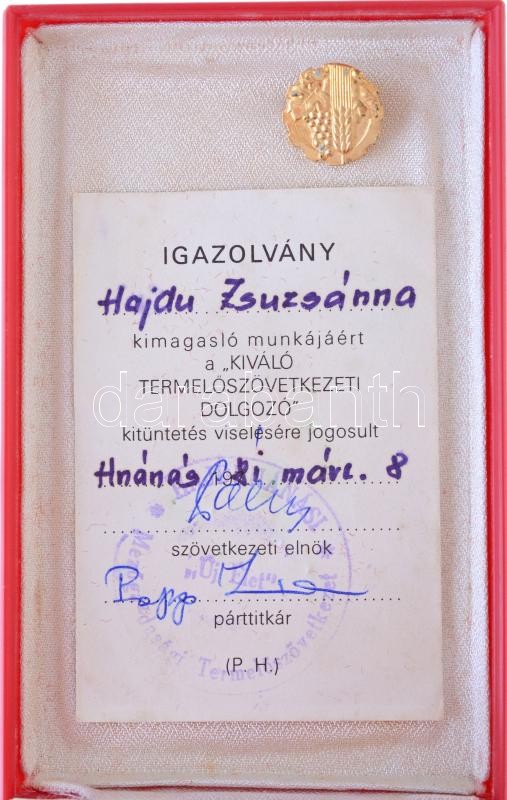 ~1970. "Kiváló Termelőszövetkezeti Dolgozó" aranyozott, műgyantás kitü... https://www.darabanth.com/de/399-Fernauktion/399.0/Numismatik/Faleristik-Auszeichnungen-Medaillen-Orden~2000017/7E1970-Kivalo-Termeloszovetkezeti-Dolgozo-aranyozott-mugyantas-kitunteto-jelveny-miniat~II2441851