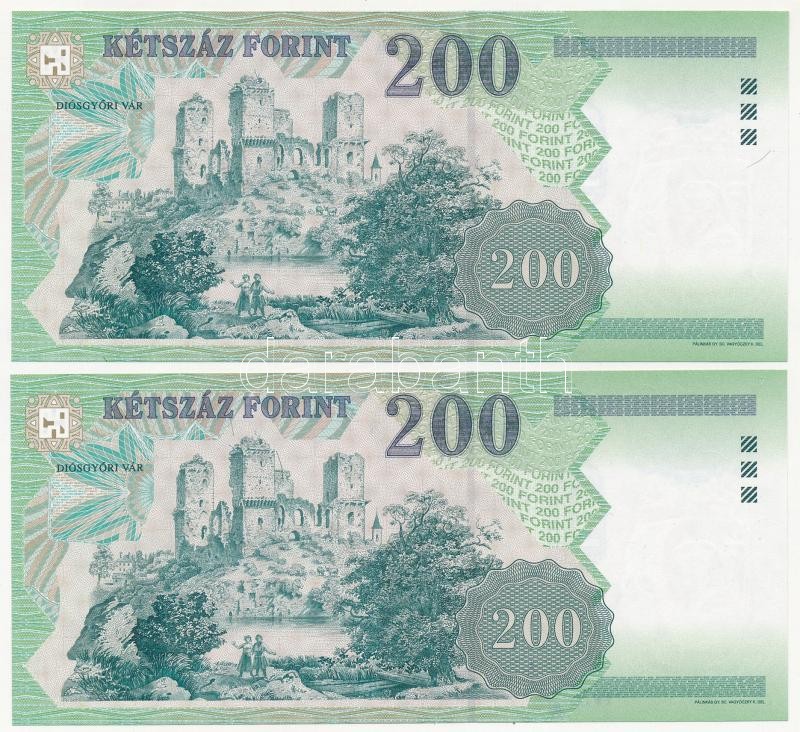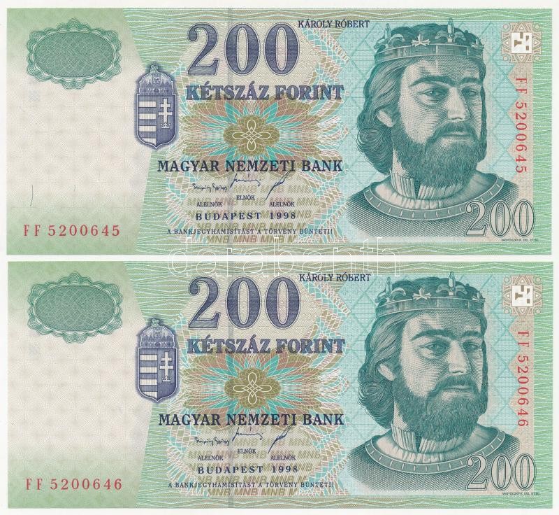 1998. 200Ft (2x) sorszámkövetők "FF 5200645 - FF 5200646" T:I https://www.darabanth.com/de/399-Fernauktion/399.0/Numismatik/Ungarische-Banknoten~2000007/1998-200Ft-2x-sorszamkovetok-FF-5200645-FF-5200646-TI~II2436699