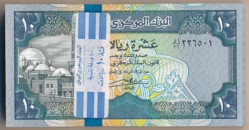 Yemen... https://www.darabanth.com/de/399-Fernauktion/399.0/Numismatik/Weltweit-Banknoten~2000012/Jemen-1992-10R-100x-banki-kotegelovel-sorszamkovetok-TI-I--Yemen-1992-10-Rials-100x-in~II2433087