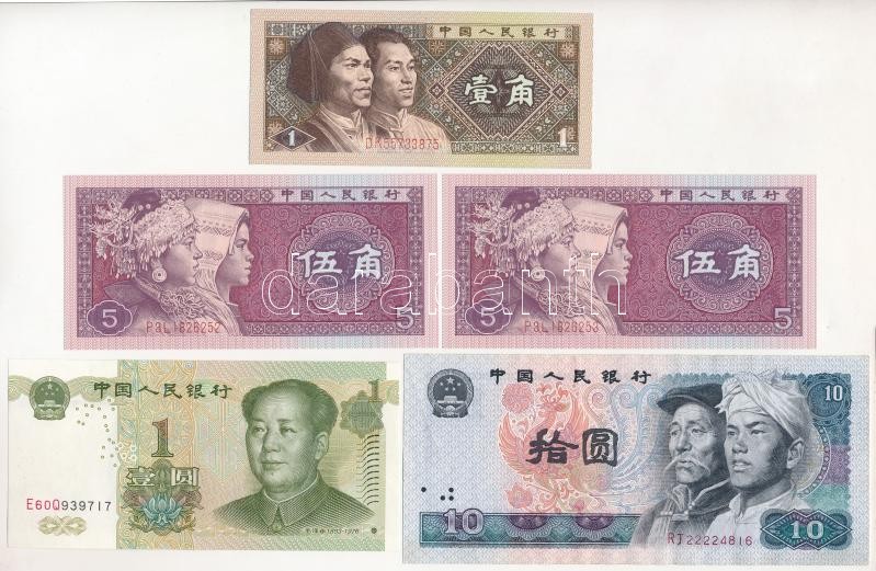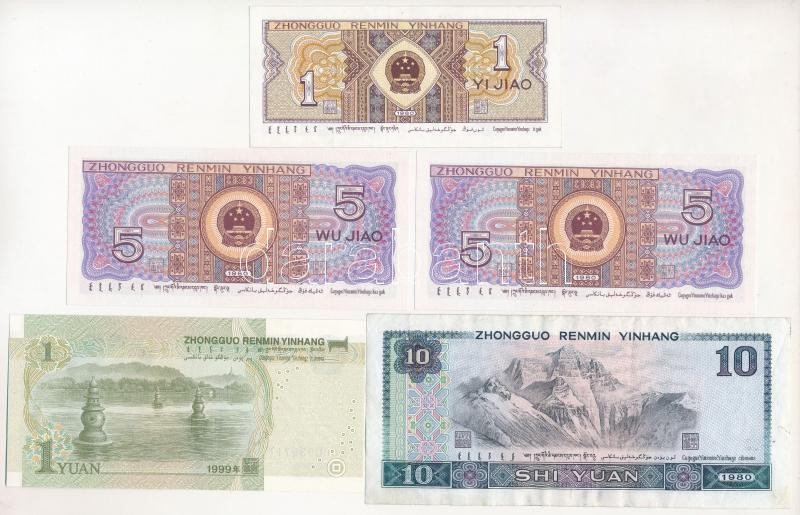 Beschreibung: Kína 1980. 1j + 1980. 5j (2x, sorszámkövető) + 1980. 10Y + 1999. 1Y T:I-III