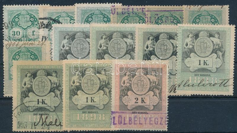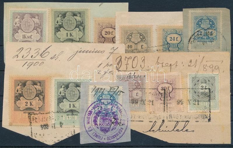 Beschreibung: 1898-1899 21 db okmánybélyeg 11 db kivágáson + 14 db okmánybélyeg, 3 db stecklapon