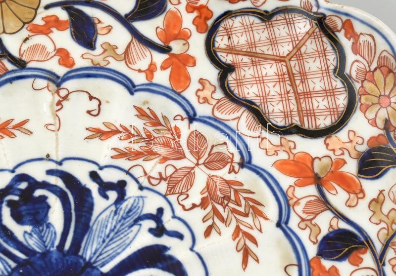 Imari tál porcelán, öblében máz alatti kékkel, máz felett vörössel és arannyal festett virág ábrázolással. kopott, apró mázrepedés. Japán, Arita, Meiji korszak (1868-1912) d: 31 cm