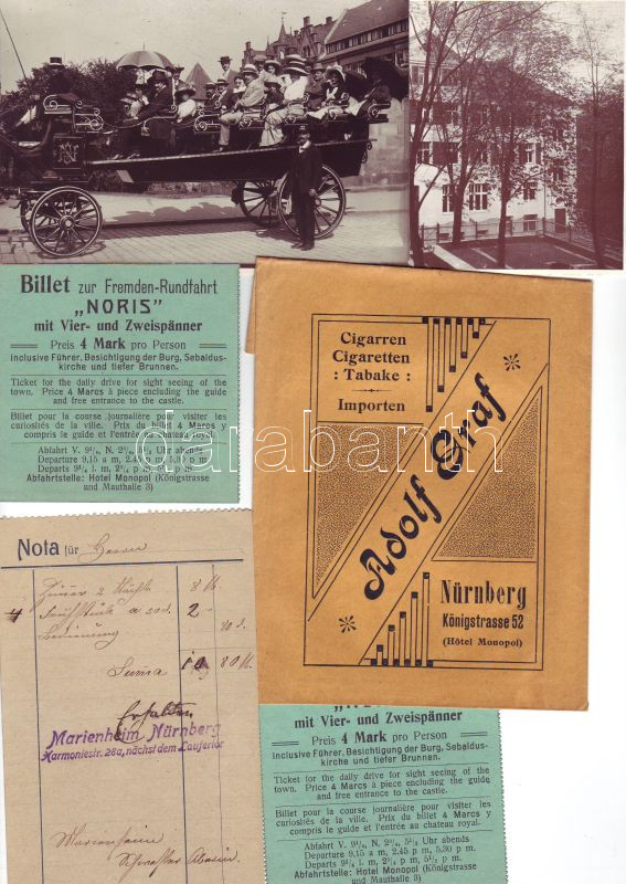Beschreibung: 1900-1940 Nürnberg, 11db reklám, jegy, számla, fotólap / 11 Stk Werbungen, Karten, Billeten, Ak, Quittung usw.