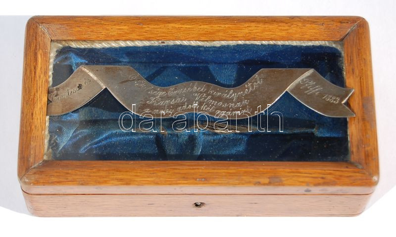 1883. Ékszertartó fadoboz üveges fedéllel, fémre vésett szöveggel: "Comtesse és Pfiffi 1883 - Ő Felsége Erzsébet királynétöl Karsai Vilmosnak a neki adott két agárért" / Schmuckkiste geschenkt von Königin Elisabeth mit Widmung