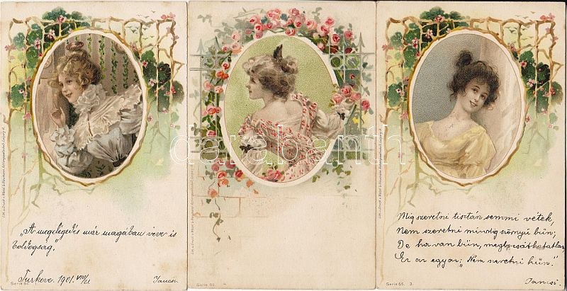 Beschreibung: 1900. Szép hölgyek, 6 klf szecesszós litho képeslap / Damen, 6 versch. Jugendstil-Lithokarten, Wezel und Neumann, Leipzig