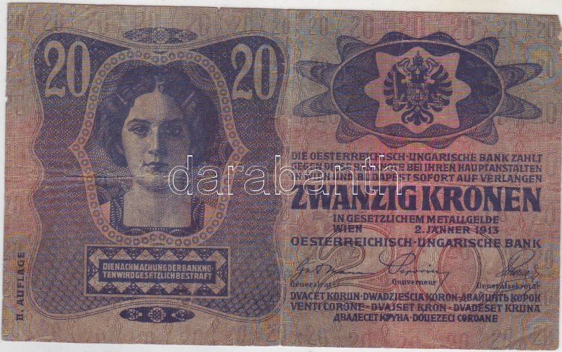 1913. 20K II. kiadás cseh ellenbélyeggel T:III https://www.darabanth.com/de/40-Fernauktion/40.0/Numismatik/~170/1913-20K-II-kiadas-cseh-ellenbelyeggel-TIII~II78138