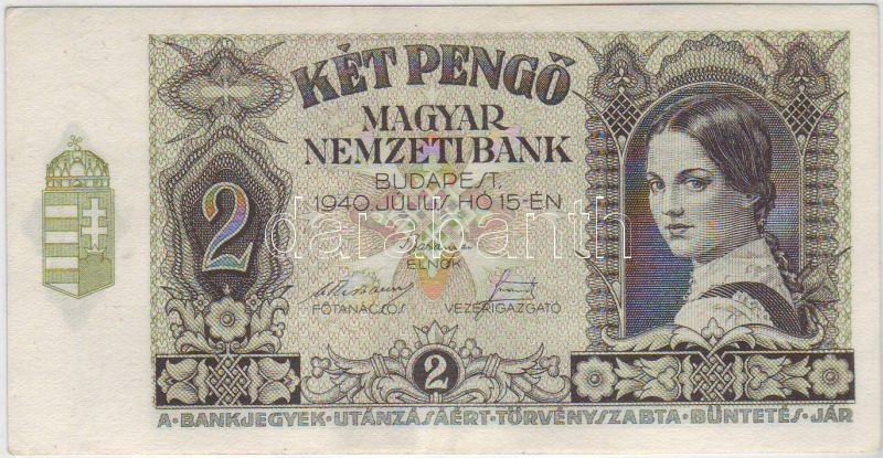 1940. 2P, sor és sorozatszám erősen felcsúszva T:I https://www.darabanth.com/de/40-Fernauktion/40.0/Numismatik/~170/1940-2P-sor-es-sorozatszam-erosen-felcsuszva-TI~II78148