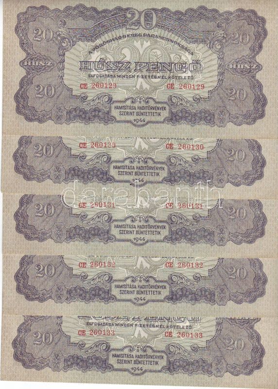 1944. 20P "V.H." (5x) egymásutáni sorszámokkal, benne elcsúszások T:I https://www.darabanth.com/de/40-Fernauktion/40.0/Numismatik/~170/1944-20P-VH-5x-egymasutani-sorszamokkal-benne-elcsuszasok-TI~II77585