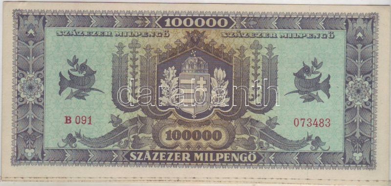 1946. 100.000Milp. előlapon erős függőleges zöld festékcsíkkal T:I https://www.darabanth.com/de/40-Fernauktion/40.0/Numismatik/~170/1946-100000Milp-elolapon-eros-fuggoleges-zold-festekcsikkal-TI~II77570