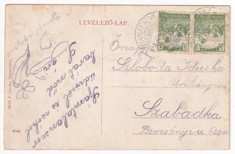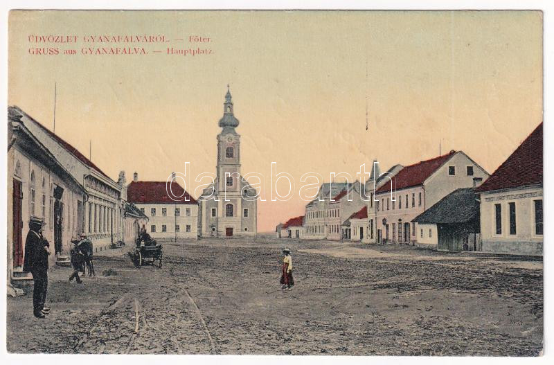 Beschreibung: 1918 Gyanafalva, Jennersdorf; Fő tér, templom, hentes üzlete. Sbüll F. István kiadása / Hauptplatz, Kirche, Fleischraufen / main square, church, butcher shop (EK)