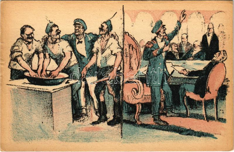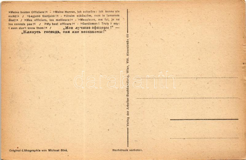 Legjobb tisztjeim! Uraim esküszöm nem is ismerem őket. Fehérterror Magyarországon. Verlag der Arbeiter-Buchhandlung / White Terror in Hungary, left-wing propaganda card, Judaica s: Bíró s: Bíró Mihály