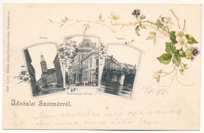 Beschreibung: 1898 (Vorläufer) Szatmárnémeti, Satu Mare; zárda, Igazságügyi palota, Vashíd. Lövy Miksa kiadása / nunnery, palace of justice, bridge. Art Nouveau, floral, litho