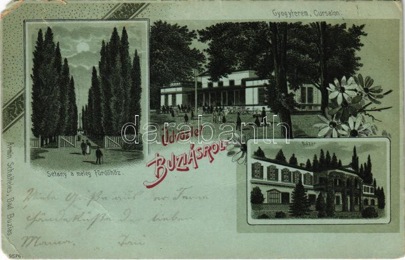1899 (Vorläufer) Buziás, Buziásfürdő, Baile Buzias; Gyógyterem, sétány a meleg fürdőhöz, bazár üzlet. Armin Schatteles kiadása / spa, promenade, shop. Art Nouveau, floral, litho (szakadás / tear)
