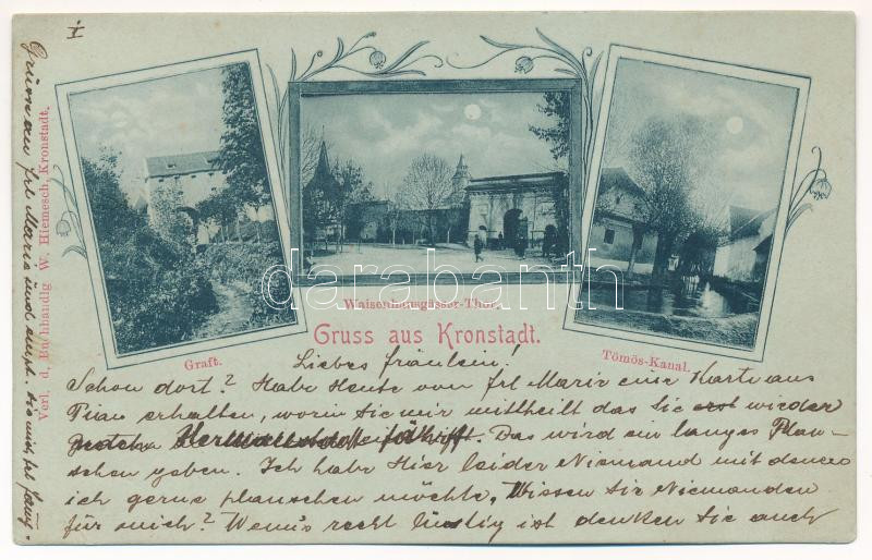 1900 Brassó, Kronstadt, Brasov; Árokmente, Tömös csatorna, Árvaház utcai kapu, este / Graft, Waisenhausgässer-Thor, Tömös-Kanal / castle, gate, canal at night. W. Hiemisch Art Nouveau, floral (EK)