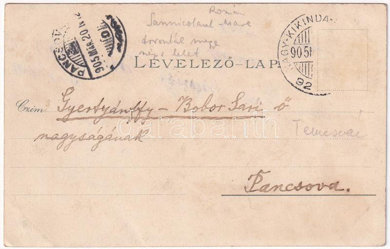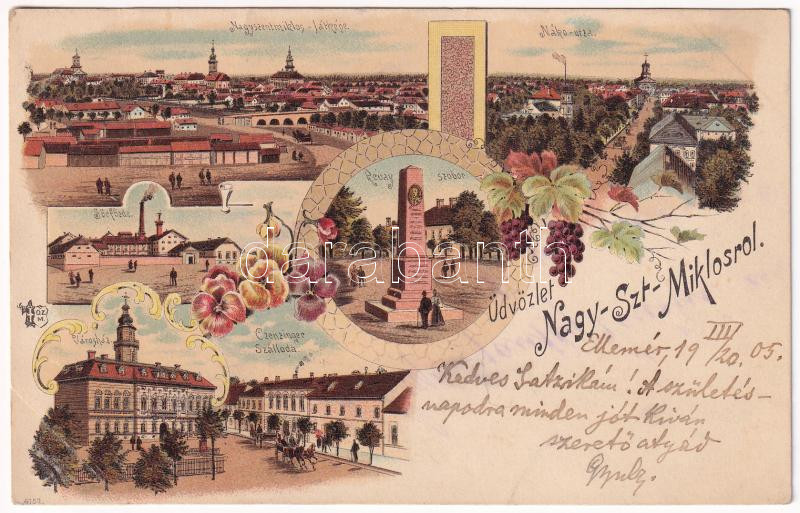 1905 Nagyszentmiklós, Sannicolau Mare; Náko utca, Sörfőzde, sörgyár, városháza, Czenzinger szálloda, Révay szobor / street, town hall, brewery, hotel, statue. O.Z.M. Art Nouveau, floral, litho (fl)