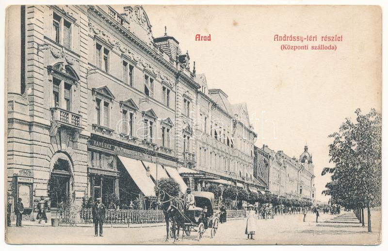 1908 Arad, Andrássy tér, Központi szálloda, Weinberger kávéház, Lengyel Lőrincz Bútorgyár üzlete, lovaskocsi / square, hotel, cafe, shops, horse cart (EK)