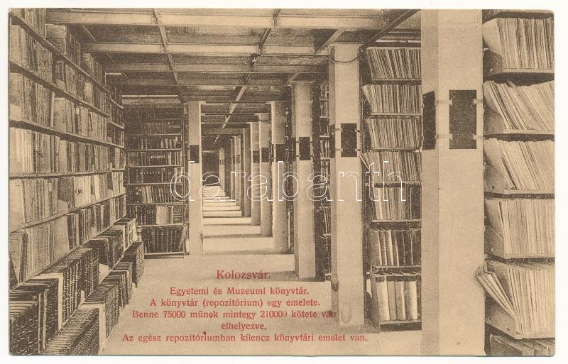 1911 Kolozsvár, Cluj; Egyetemi és múzeumi könyvtár, belső, a repozitórium egy emelete a kilencből, 75000 műnek mintegy 210000 kötete van benne / library of the university and museum, interior