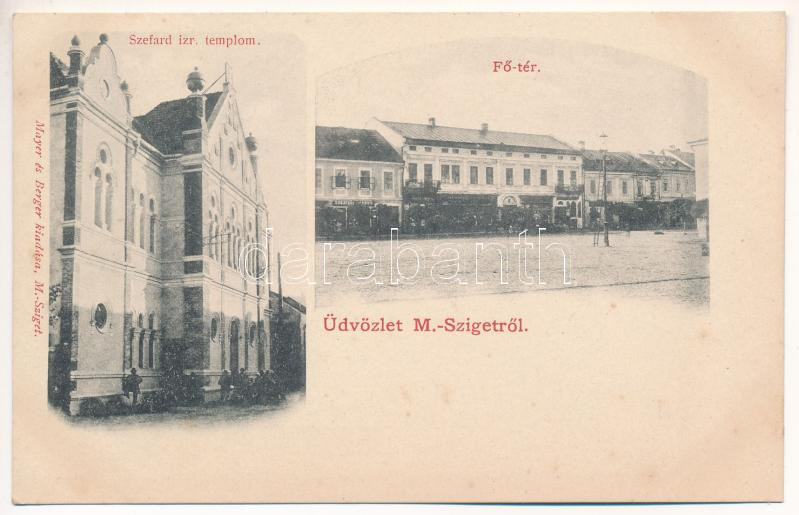 Beschreibung: Máramarossziget, Sighetu Marmatiei; Szefárd (Klausz Wisnitzer) izraelita templom, zsinagóga, Fő tér, Sugatagi üzlete. Mayer és Berger kiadása / synagogue, main square, shops