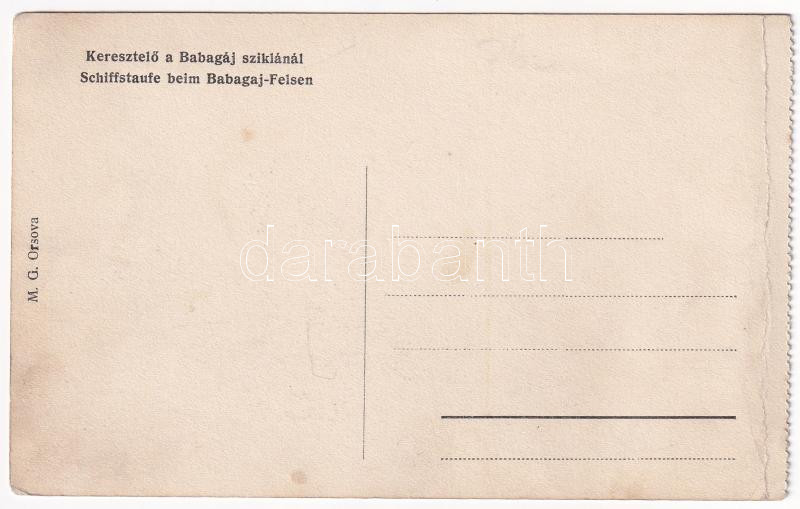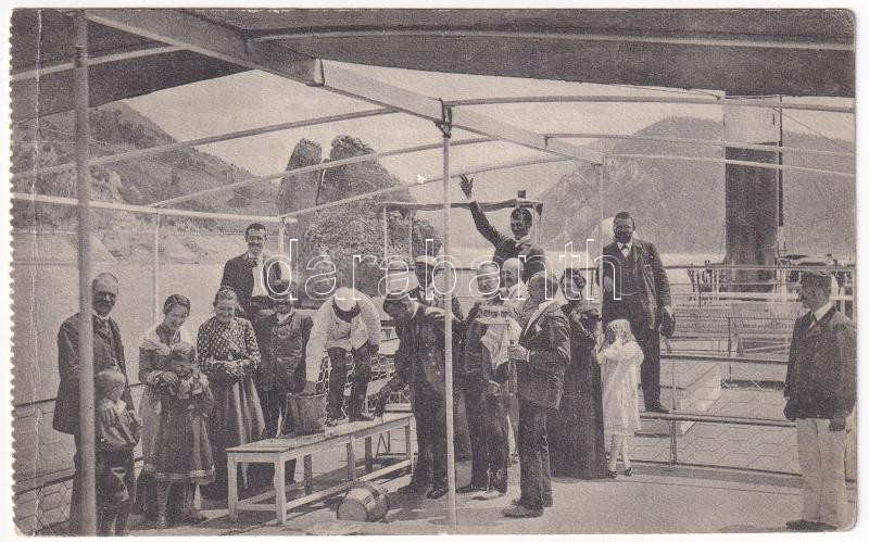 Orsova, Al-Duna (Vaskapu-szoros, Portile de Fier); Gőzhajó keresztelő a Babagáj (Babakáj) sziklánál / Schiffstaufe beim Babagaj-Feisen / steamship christening by the Babagaj rock (fa)