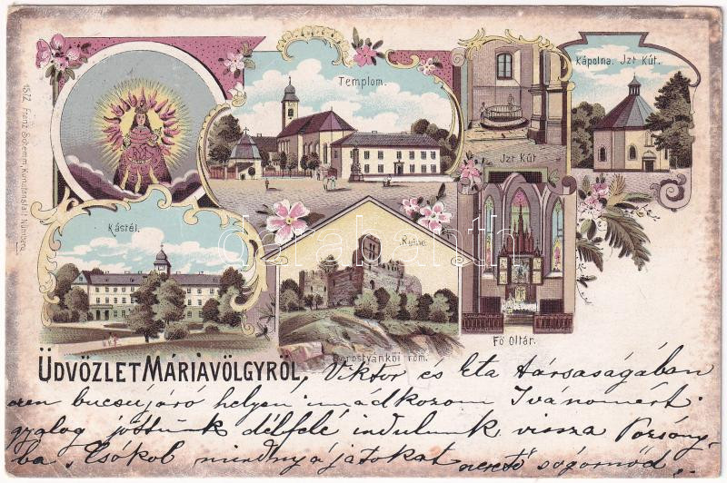 1899 (Vorläufer) Máriavölgy, Marienthal bei Pressburg, Marianka (Pozsony, Bratislava); Templom belső, Szentkút kápolna, Kastély, Borostyánkői várrom, Főoltár / church, chapel, Pajstúnsky hrad castle, main altar, interior. Franz Schemm Art Nouveau, floral, litho (EK)