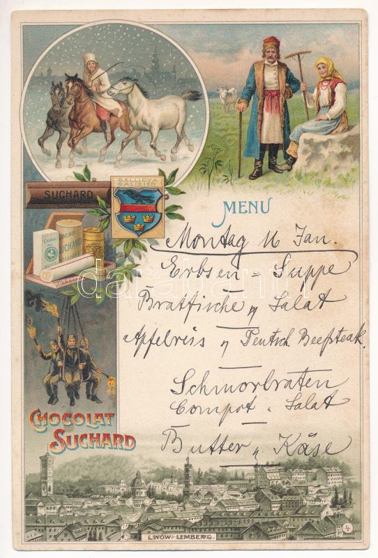 Lviv, Lwów, Lemberg (Gallicya, Galizien); Menu - Chocolat Suchard / Sw... https://www.darabanth.com/de/40-Gross-Auktion/40.1/Ansichtskarten/Ukraine~16561/Lviv-Lwow-Lemberg-Gallicya-Galizien-Menu-Chocolat-Suchard-Swiss-chocolate-advertising-fo~II2876579