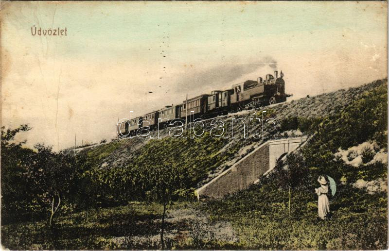 1911 Bácskossuthfalva, Kossuthfalva, Moravica, Ómoravica, Ómoravicza, Stara Moravica; vasúti töltés, gőzmozdony, vonat. Berger Sándor kiadása / railway embankment, train, locomotive (fa)