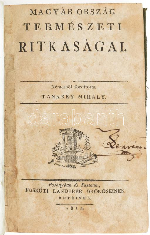 Tanárky Mihály: Magyarország természeti ritkaságai. Németből ford. - -. Pozsony-Pest, 1814., Füskúti Landerer örökösei, 127+1 p. Ritka! Hozzákötve: A' Fösvény ángy, a' vagy Amália és Albert, egy nagyon szivre ható 's bájos, de magában még is valóságos eredetű történet. Pozsony-Pest, 1807., Füskúti Landerer Mihály betűivel és költségével, 2+150+4 p. Egyetlen kiadás. Korabeli egészvászon-kötésben, kopott borítóval, foltos lapokkal, hiányzó címképekkel, az első címlapon névbejegyzéssel.