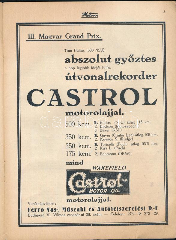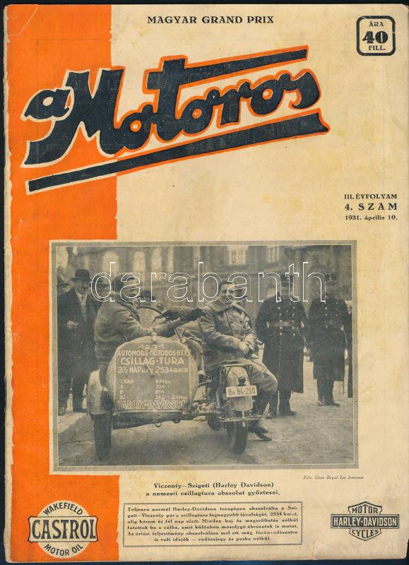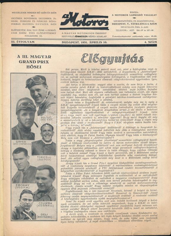 1931 A Motoros, Magyar Grand Prix III. évfolyam 4. szám, szakadással, ... https://www.darabanth.com/de/40-Gross-Auktion/40.1/Kunst-Skulpturen-Historische-Dokumenten/Drucksachen~16417/1931-A-Motoros-Magyar-Grand-Prix-III-evfolyam-4-szam-szakadassal-20p~II2879906
