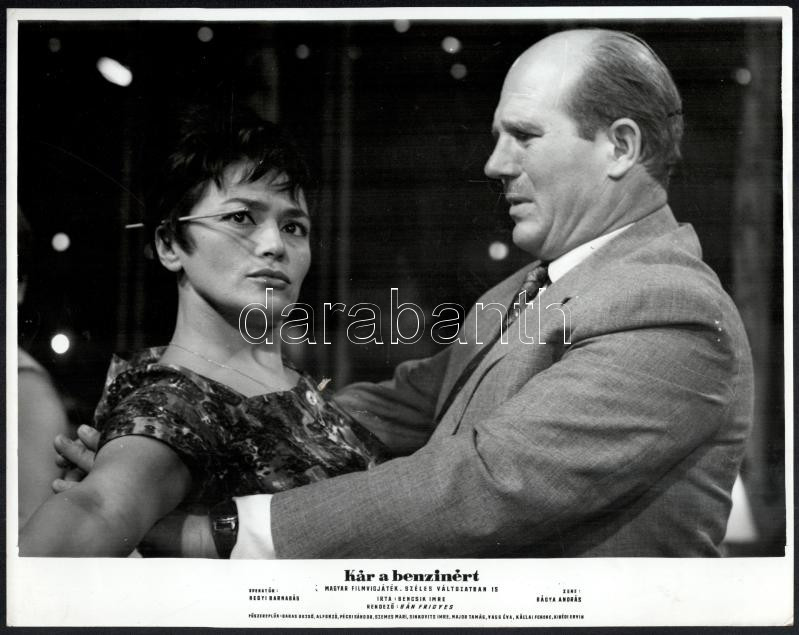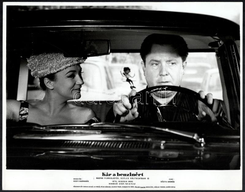 cca 1964 ,,Kár a benzinért" című magyar film jelenetei és szereplői (köztük Pécsi Sándor, Szemes Mari, Sinkovits Imre, Major Tamás, Kállai Ferenc), 13 db vintage produkciós filmfotó, ezüst zselatinos fotópapíron, a használatból eredő (esetleges) kisebb hibákkal, 24x30 cm