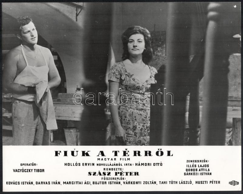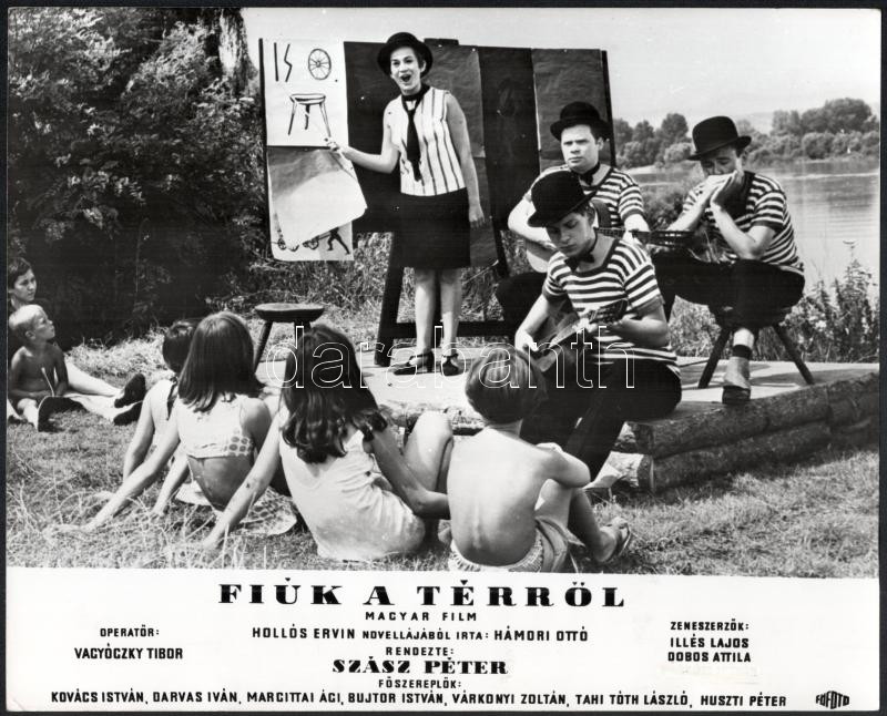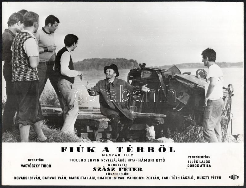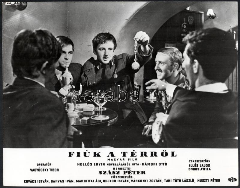 cca 1967 ,,Fiúk a térről" című magyar film jelenetei és szereplői (köztük Bujtor István, Darvas Iván, Huszti Péter, Tahi Tóth László), 13 db vintage produkciós filmfotó, ezüst zselatinos fotópapíron, a használatból eredő (esetleges) kisebb hibákkal, 24x30 cm