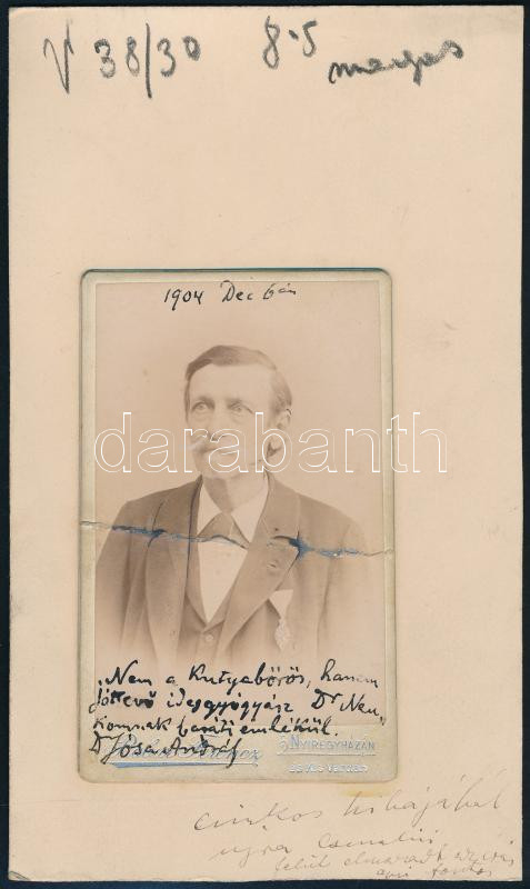 Beschreibung: 1904 Jósa András (1834-1918) régész, orvos és antropológus autográf dedikációjával ellátott vizitkártya fotója. Sérült, lapra ragasztva