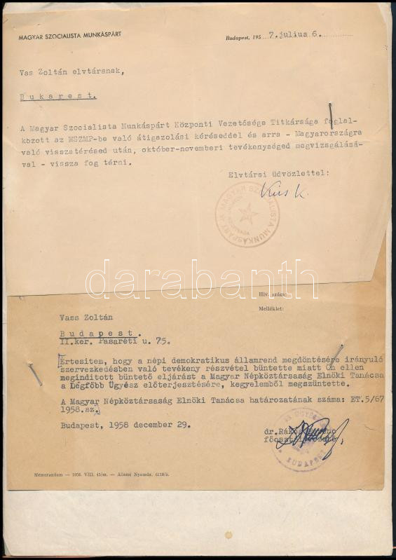 1957,1958 Vas Zoltán (1903-1983) író, 56-os államminiszter, (akit Nagy Imrével együtt Romániába deportáltak a forradalom után) részére szóló értesítés, melyben 1956-os szerepének megvizsgálsáról értesítik az MSZMP-be való jelentkezése kapcsán. Valamint 1958-as értesítése a népi demokratikus államrend megdöntésére irányuló szervezkedésben való részvétel bűntette miatt indított eljárásnak az Elnöki Tanács általi, kegyelemből való megszüntetéséről Vas Zoltán 1956 után politikai tisztséget már nem viselt, írásból élt és lassan szembe került a rendszerrel. Nem a tejes csenget című, tervezett visszaemlékezése kapcsán izgatás miatt eljárás indult ellene és könyvét a hatóságok nem engedték megjelenni.