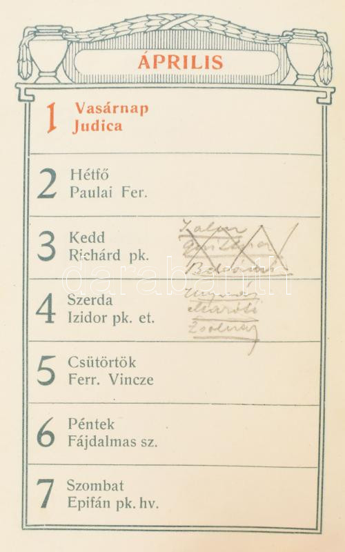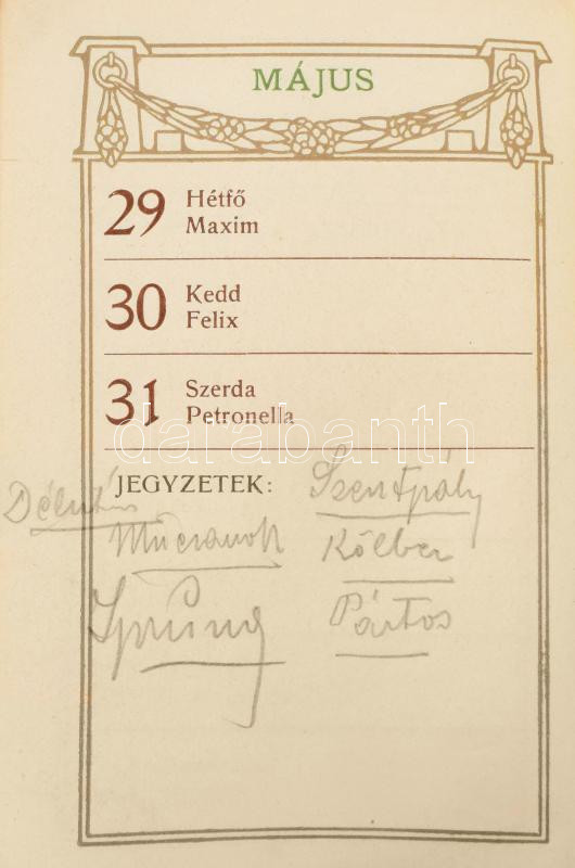 VÉDETT!!! 1905-1906 Róth Miksa (1865-1944) üvegfestő és mozaikművész határidő naplói (1905, 1906), autográf bejegyzésekkel, benne számos névvel (Zsolnay, Pártos, Gerle, Alpár, József főherceg, Árkay, Hegedüs, Tüköry?stb.) és időponttal, munkákkal (Vidor sörfőzde (Vidor Emil: Polgári Serfőzde bérház), Bazilika, József főherceg (palota?), Osztrák-Magyar Bank, Kolozsvári Egyetemi Könyvtár, Gresham, Clotild-javítás, ...stb.), néhány skiccel, összegekkel. Horványszky VIktor cs. és kir. udv. könyvnyomdájának 1905-ös és 1906-os zsebnaptáraiban. Bennük szecessziós címlapokkal. Kiadói szecessziós aranyozott egészbőr-kötések, aranyozott lapélekkel, a borítón kopásnyomokkal, az 1906-os kötése javított, az egyikben néhány (1906) és a másikban számos bejegyzéssel (1905.) Rendkívül izgalmas dokumentum.
