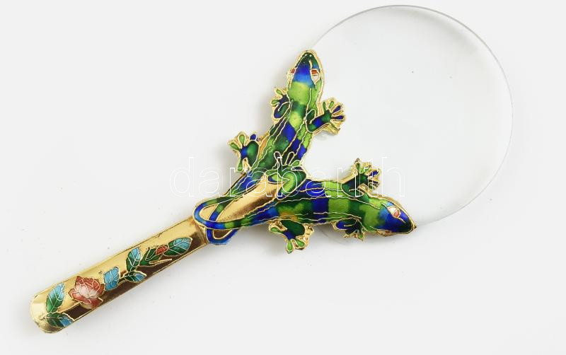 Aranyozott tűzzománc díszítésű asztali nagyító, cloisonne technikával megformált négy sok szinű gekkó tartja a hibátlanul csiszolt 7 cm átmérőjű lencsét,virágdíszes aranyozott fogóval, újszerű állapotban, dobozában.