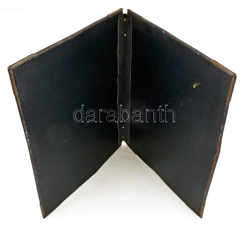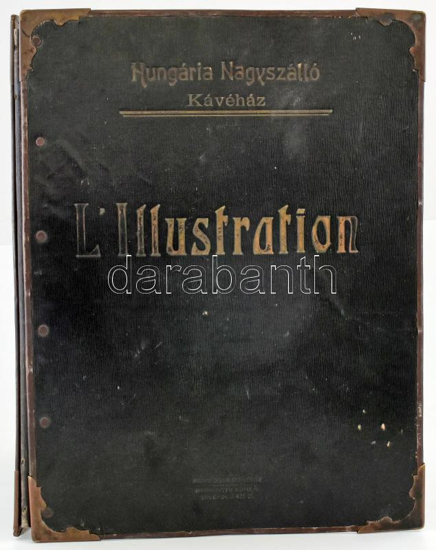 cca 1920 A Hungária Nagyszálló (Grand Hotel Hungária) kávéházának újságtartója, a ,,L'Illustration'' c. francia hetilap számára (a szálloda külföldi lapokat is járatott nemzetközi vendégei számára). Nagyméretű, rézveretes, bőr borítású kartonmappa, rajta dombornyomott, aranyszínű betűkkel a szálloda/kávéház nevével és a folyóirat címével, valamint ,,Minta védelem bejelentve, Berkovits Sip-u. 4.'' felirattal. Korának megfelelő kopásokkal, minimális sérülésekkel, 42x32 cm