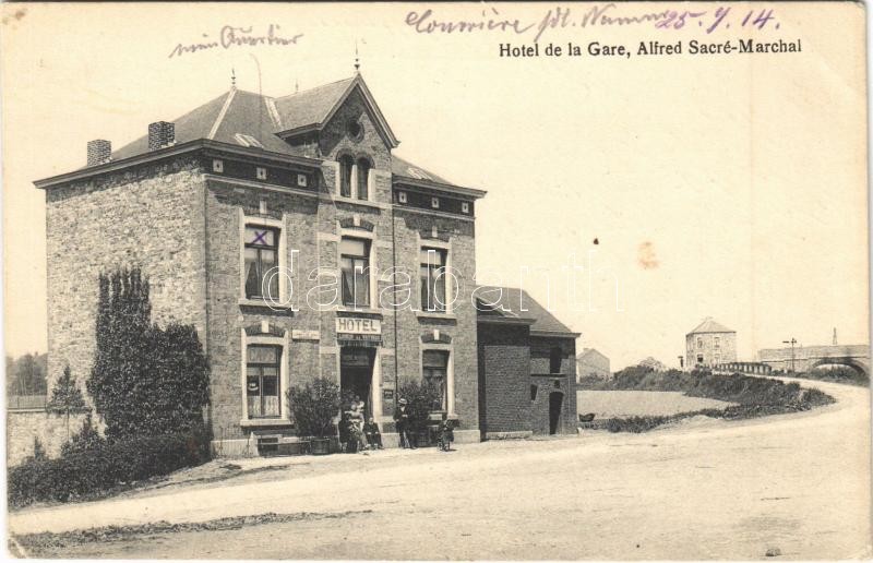 1914 Courriere, Hotel de la Gare, Alfred Sacré-Marchal / railway hotel... https://www.darabanth.com/de/400-Fernauktion/400.0/Ansichtskarten/Belgien~1000027/1914-Courriere-Hotel-de-la-Gare-Alfred-Sacre-Marchal-railway-hotel-cafe-and-restaurant-EB~II2412699