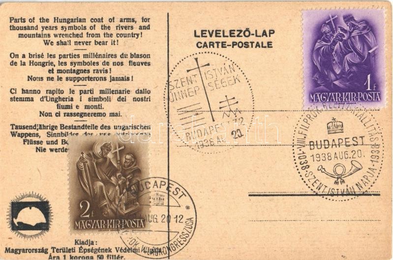 Ez legyen ezentúl Magyarország címere? Magyarország Területi Épségének Védelmi Ligájának kiadása / That would be the new coat of arms of Hungary? Hungarian irredenta propaganda, Trianon s: Tary L. + "Szent István Ünnepségek Budapest 1938. AUG. 20." "VIII. FILPROK Bélyegkiállítás Szent István Napja 1938. AUG. 20." So. Stpl. (EK)