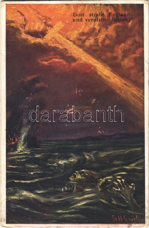 1915 Gott strafe England und vernichte Italien! / WWI German Navy (Kaiserliche Marine) and Austro-Hungarian Navy, K.u.K. Kriegsmarine art postcard, Anti-Italian and Anti-British propaganda. B.K.W.I. 259-123. artist signed (gyűrődés / crease)