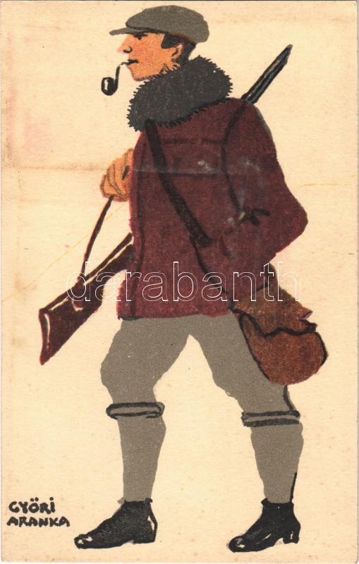 Vadász. Diana Istennő útjait járom, s mindig sósborszeszét használom! reklám / Ungarische Werkstätte / Hungarian hunter art postcard. Advertisement on the backside s: Győri Aranka