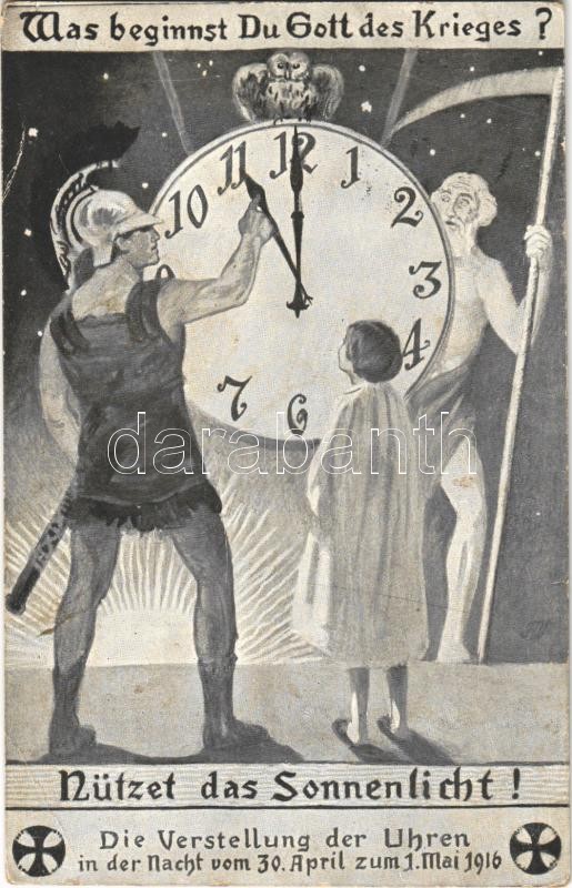 1916 Was beginnst du Gott des Krieges? Nützet das Sonnenlicht. Die Verstellung der Uhren in der Nacht vom 30. April zum 1. Mai 1916 / WWI German and Austro-Hungarian K.u.K. military propaganda, adjustments to the clock, Daylight saving time (way to conserve coal during wartime) (EB)