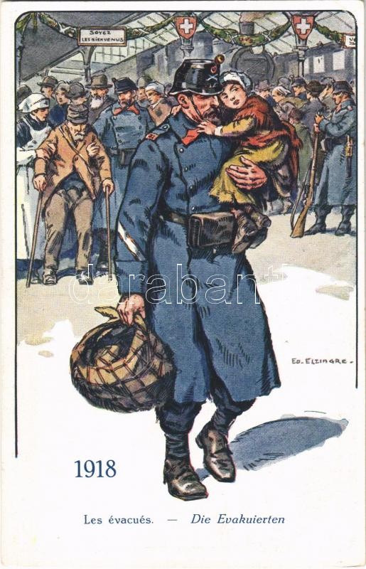 1918 Les évacués. Le Soldat Suisse a travers les Ages / Die Evakuierten. Der Schweizer-Soldat im Laufe der Jahrhunderte / WWI Swiss military art postcard s: Ed. Elzingre (EK)